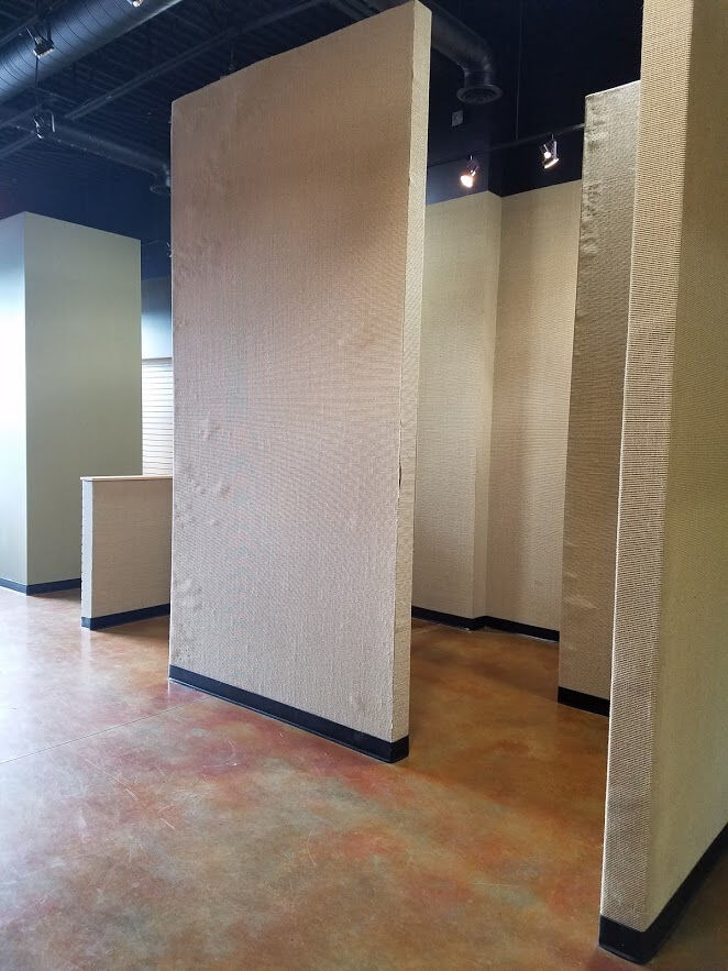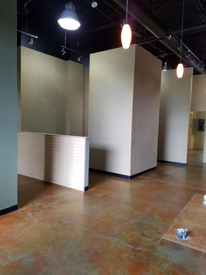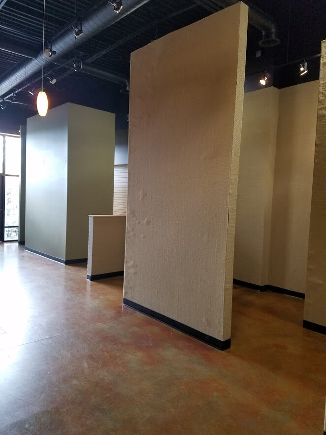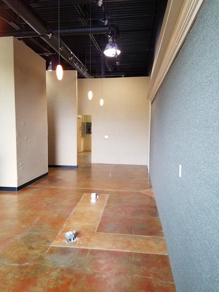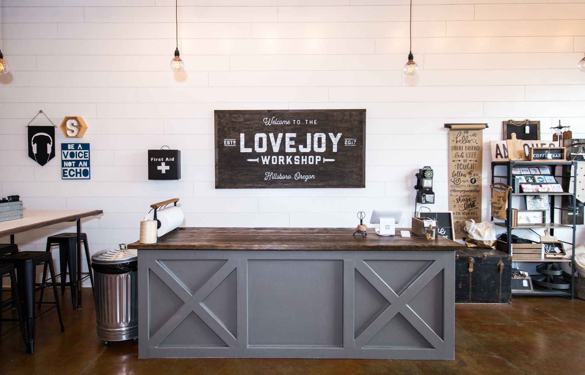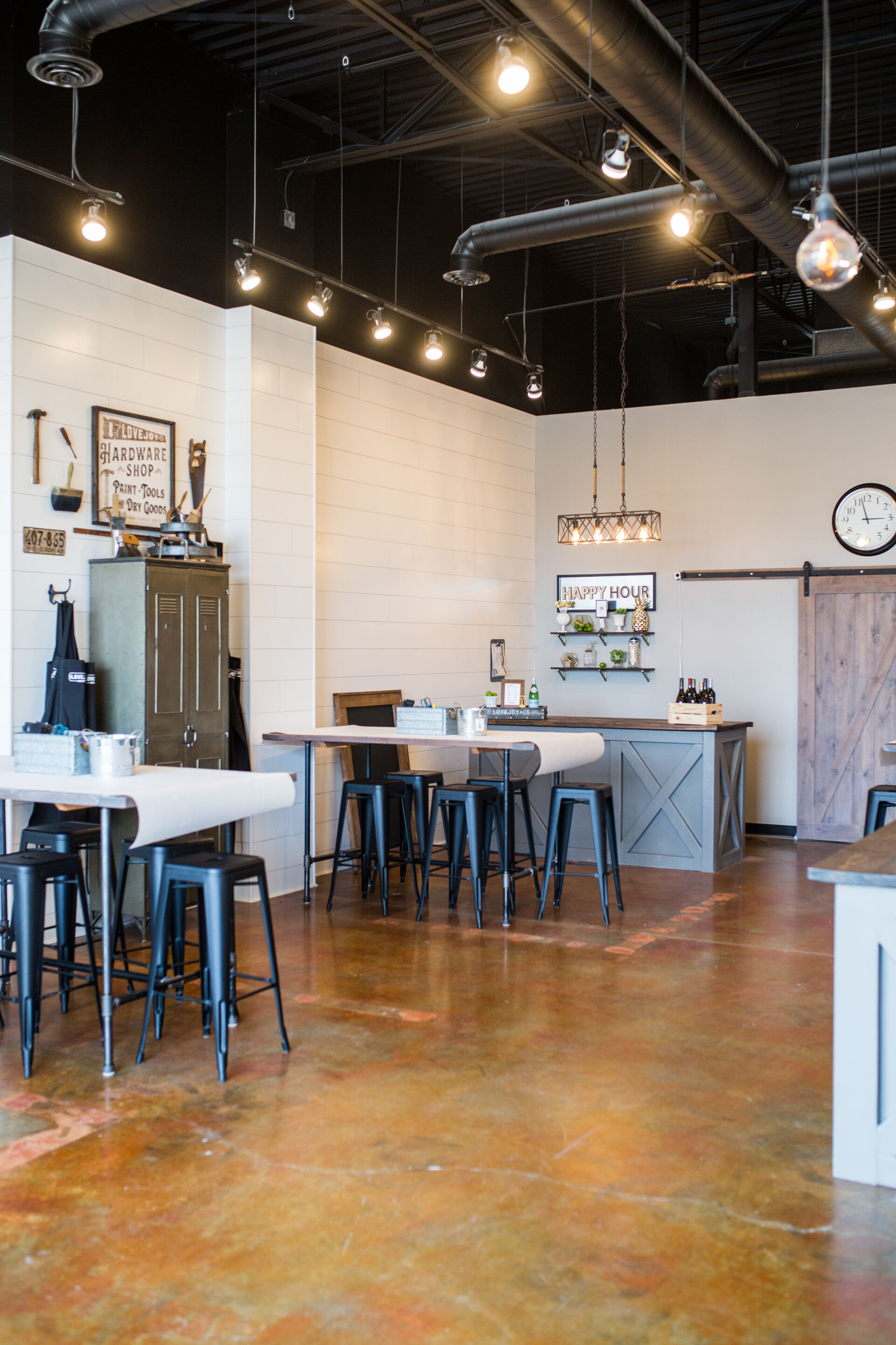 This old retail space was transformed into a home décor workshop and is a Regional CotY Award winning commercial space! The original area was partitioned and had dark tinged walls. We transformed the spot using a modern, rustic, farmhouse-style aesthetic, incorporating aged woods, linen fabrics and metal details into the design. The new, wide-open space features 12-foot tall shiplap walls, a custom barn door and drop pendants. The stained concrete floors were repaired as well. Layering warm wood tones over a neutral color palette makes this modern rustic look a timeless design.