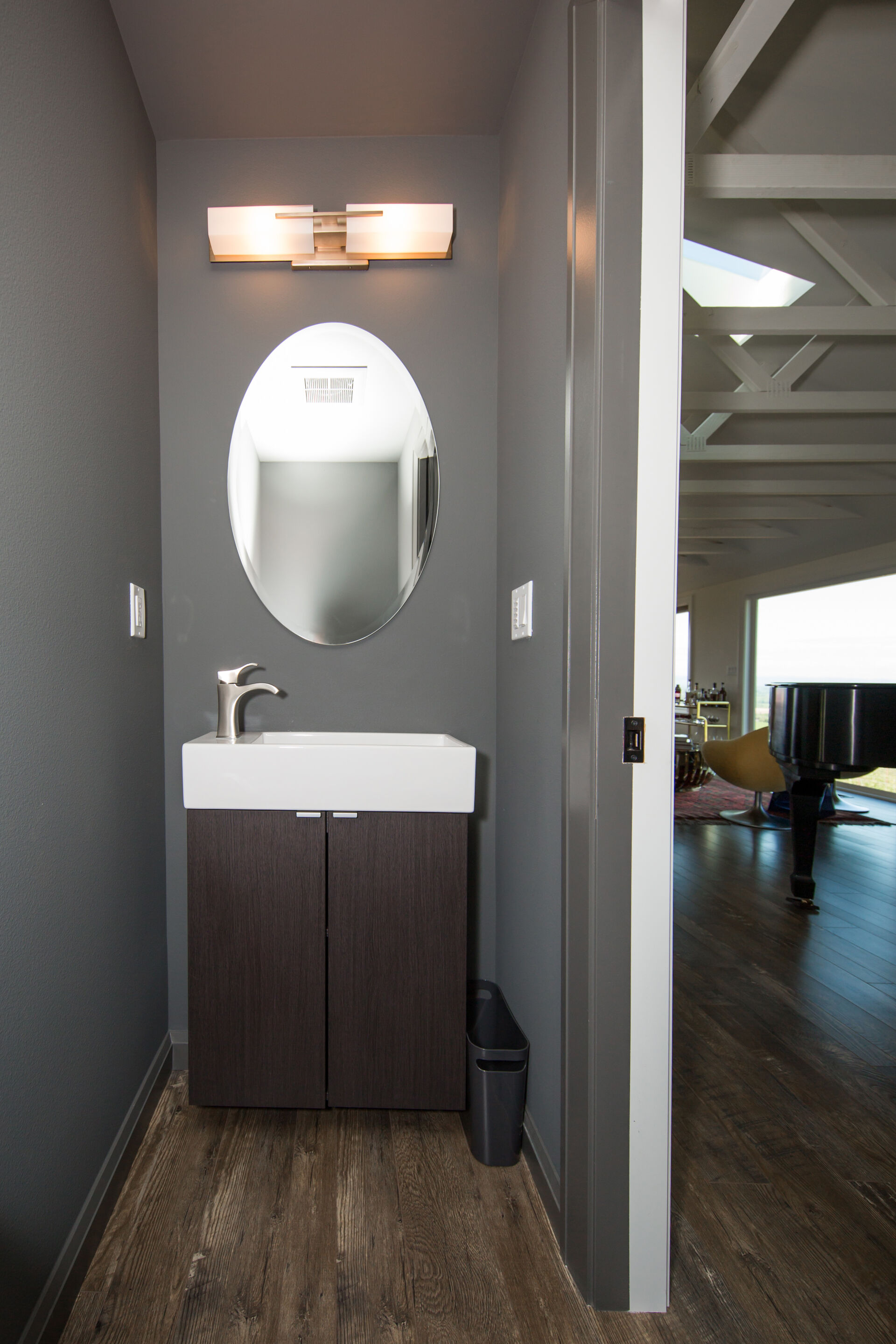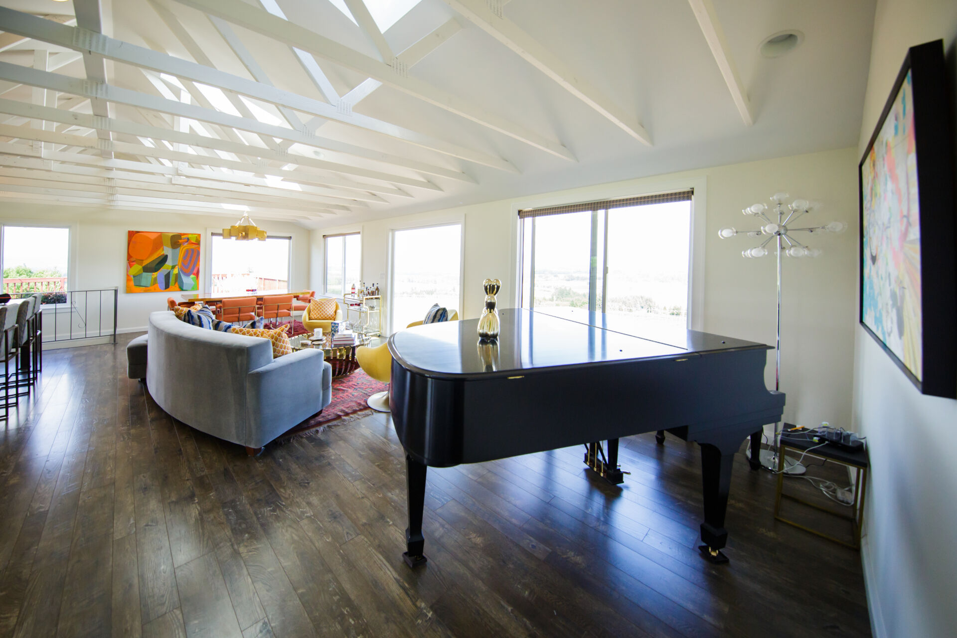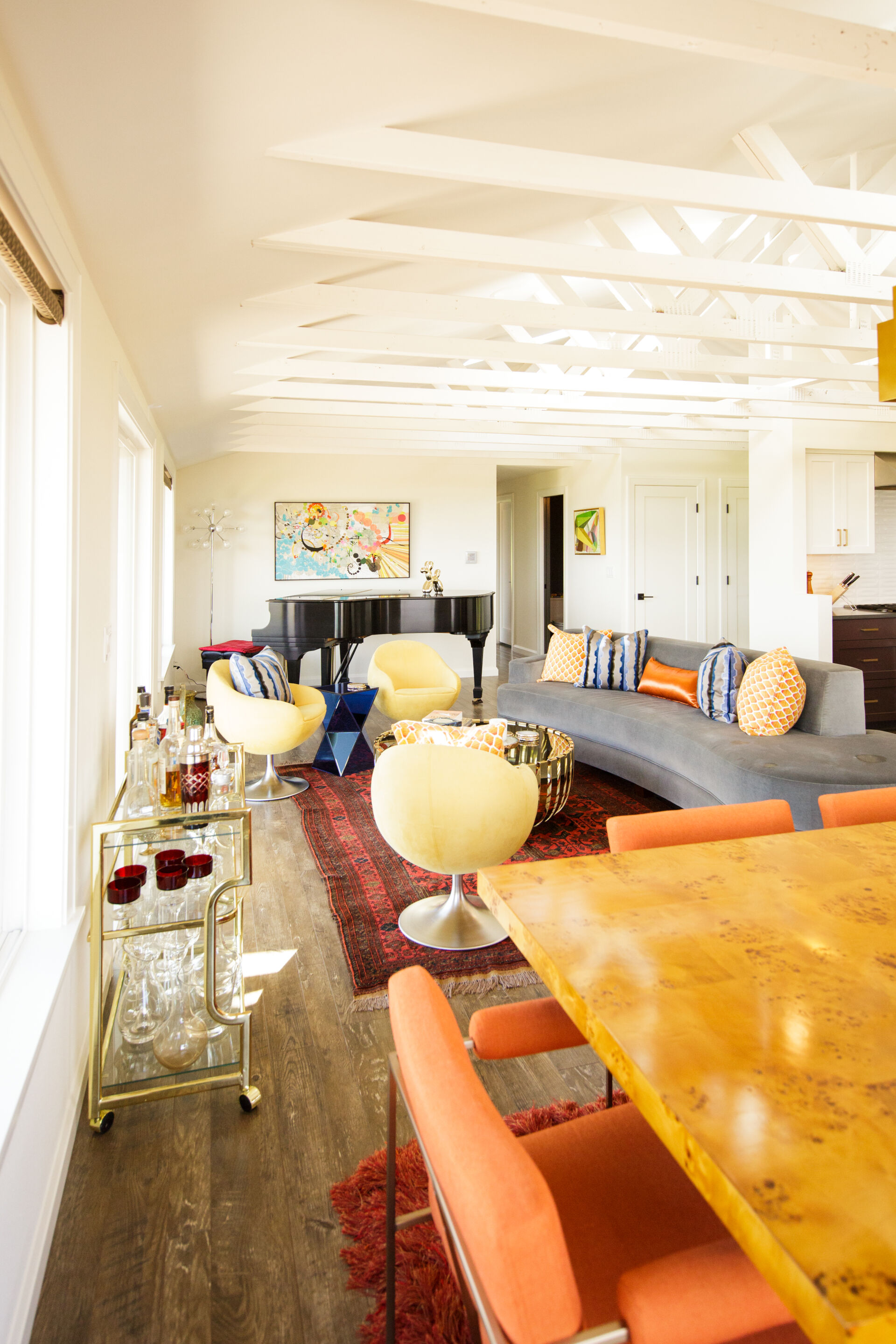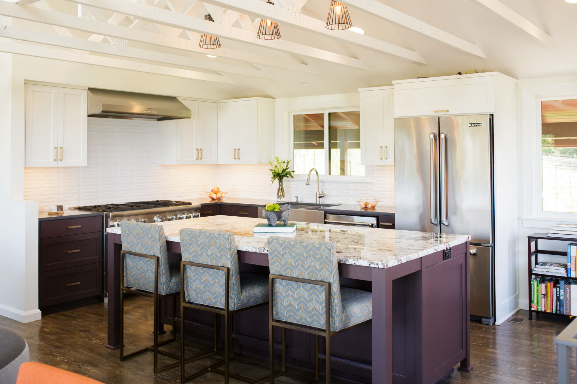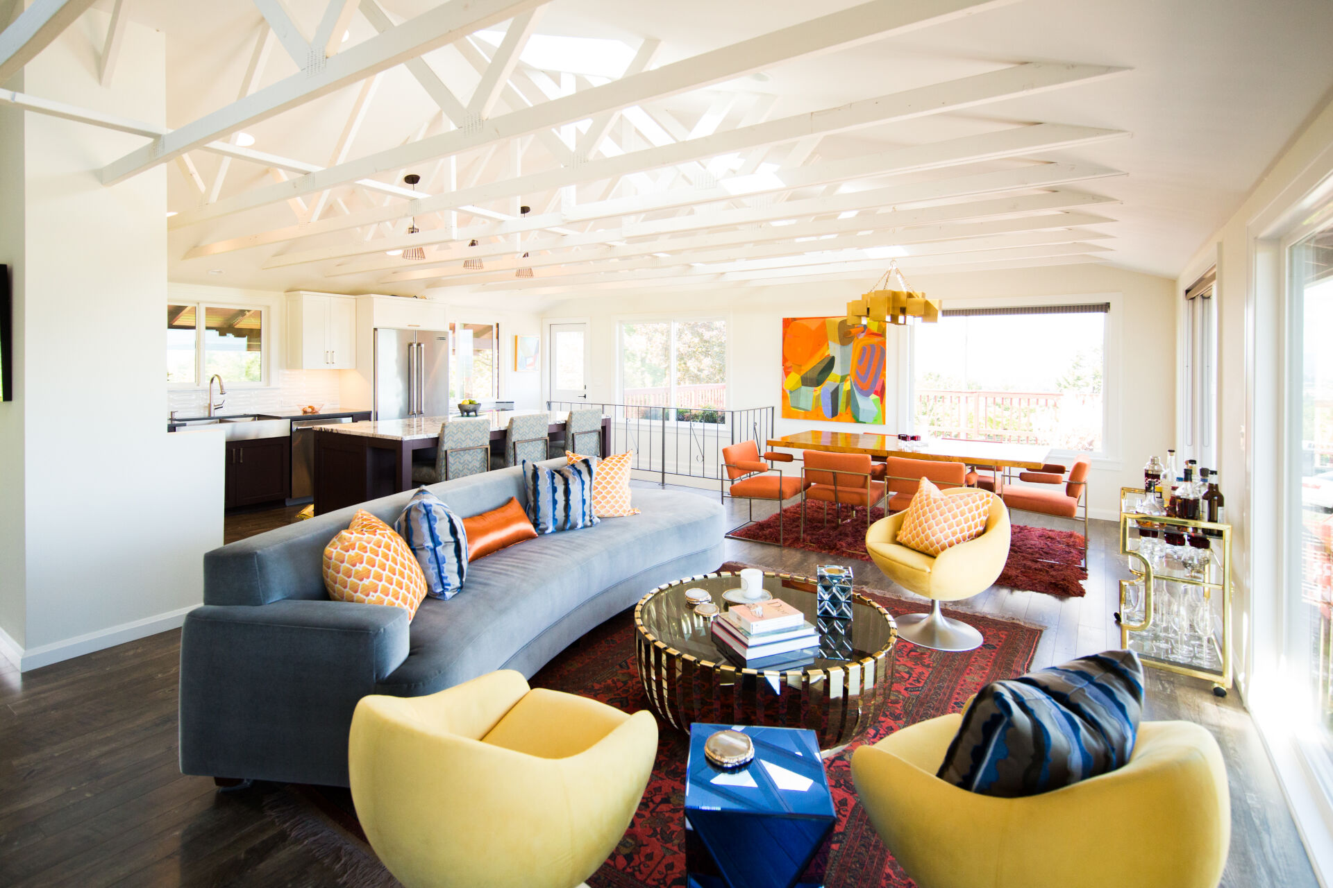 This stunning CotY Regional award winning home metamorphosed a dull house and kitchen into a sleek and inviting home. The new design was perfectly created to suit their retro interior personalities. The exposed trusses provide support that allows the homeowner to to incorporate open-concept floor plans and features without the need for load-bearing interior walls.