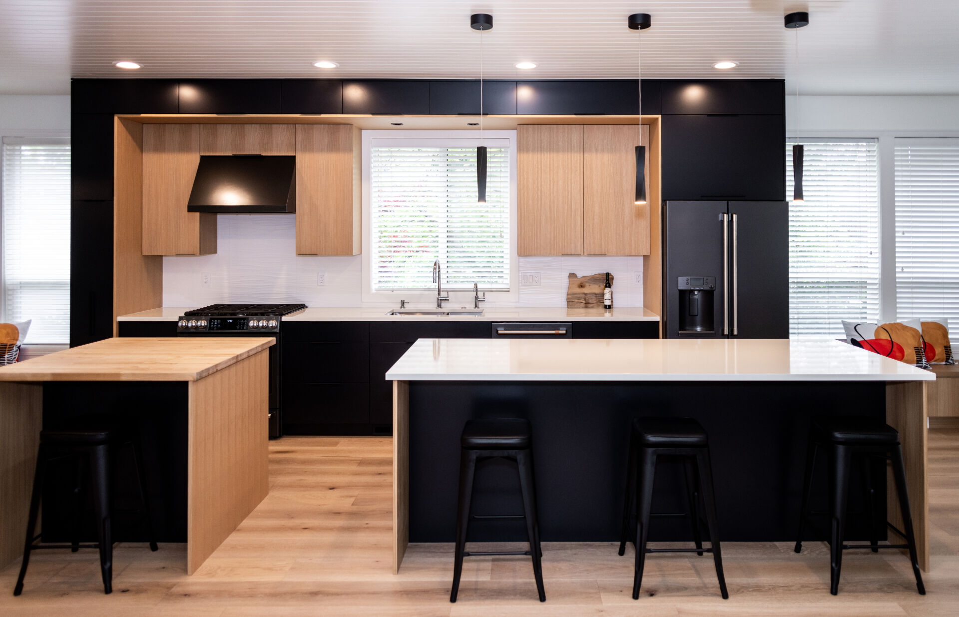 The look is complemented with Cascade White Pental Quartz countertops. The smaller of the two islands has a drawer microwave and butcher block top. There are two cozy sitting nooks with additional storage on each end of the kitchen. The contemporary round chandelier and pendant lighting complete this space and make a bold and unique statement. The look is complemented with Cascade White Pental Quartz countertops. The smaller of the two islands has a drawer microwave and butcher block top. There are two cozy sitting nooks with additional storage on each end of the kitchen. The contemporary round chandelier and pendant lighting complete this space and make a bold and unique statement.