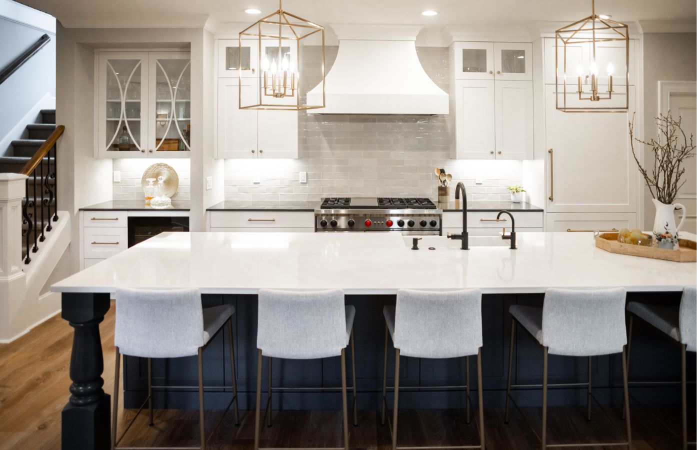 We installed custom cabinetry tailored to the family’s storage and aesthetic preferences, with clean lines and quality finishes that added depth and sophistication. Quartz countertops, a full-height backsplash, and professional grade appliances (Sub Zero refrigerator, Wolf range, Vent-a-Hood range vent, Asko dishwasher) brought a sleek and modern edge, while under-cabinet lighting and thoughtful task zones enhanced usability. The result is a bright, open kitchen that’s as practical as it is beautiful.